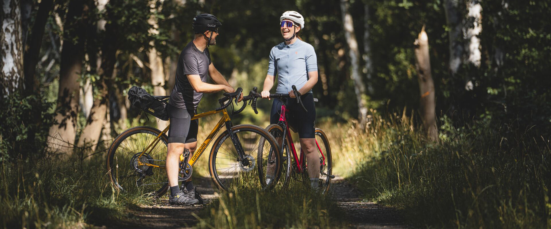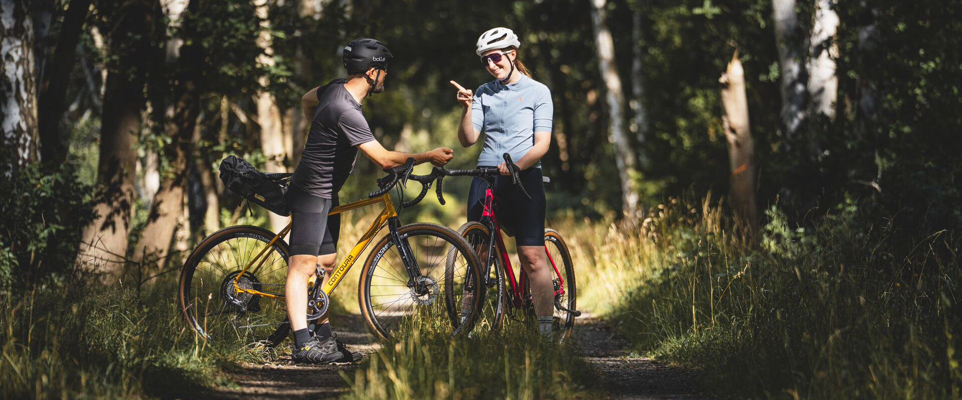 - Vornehmlich haben die Entwickler bei CONTOURA das Gravelbike für Touren querfeldein auf Wald- und Feldwegen konzipiert. Dafür sprechen die agile Fahrweise und die sportliche Sitzposition ebenso wie eine der wählbaren Gravel-Schaltgruppen von Shimano und die breiten Stollenreifen.